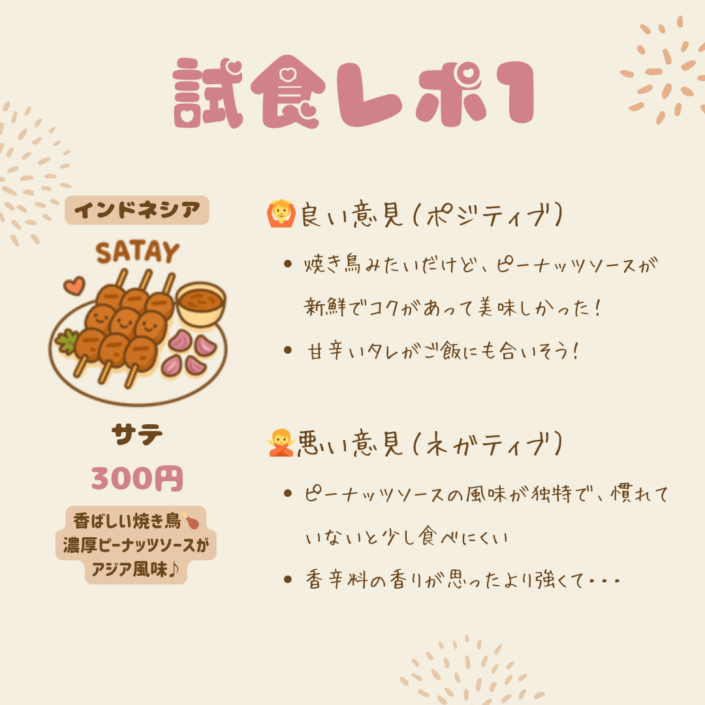 ・💭「焼き鳥みたいだけど、ピーナッツソースが新鮮でコクがあって美味しかった!」