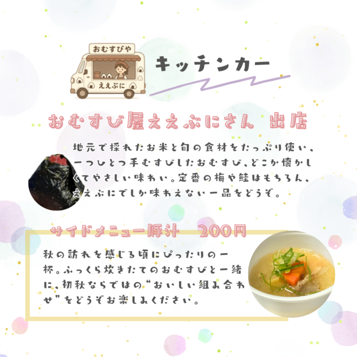 🟠おむすびやええぶにさんのキッチンカーのメニューです。